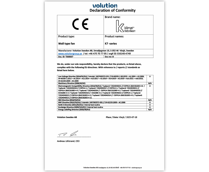 Klimat K7 – Tillverkardeklaration